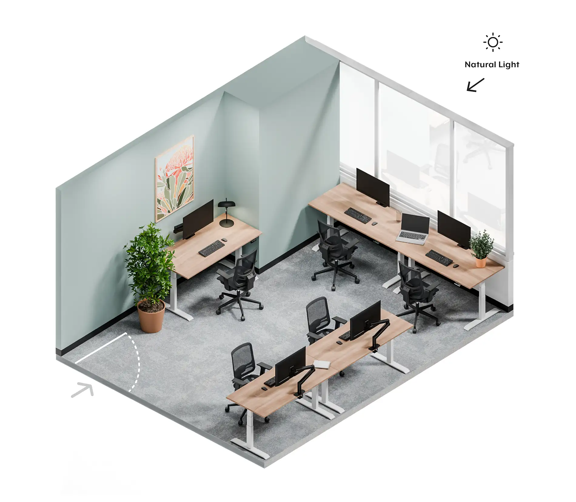 Perfect for a team of up to 5 people, this window-facing suite boasts and abundance of natural light and can be fully furnished upon request*. Members also enjoy access to digital reception, breakout lounges, kitchens, end of trip facilities, and toilets. Additionally, there is street parking for staff and clients.